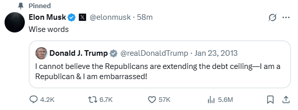 Prior to Trump's comments, Musk spent much of the morning re-posting old Trump tweets calling for no ficits and to stop raising the debt ceiling.