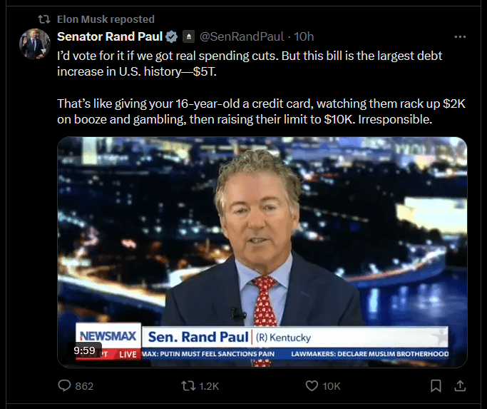 Musk also reposted Senator Rand Paul suggesting that he would vote for the BBB "if we got real spending cuts" instead of "the largest debt increase in US history."