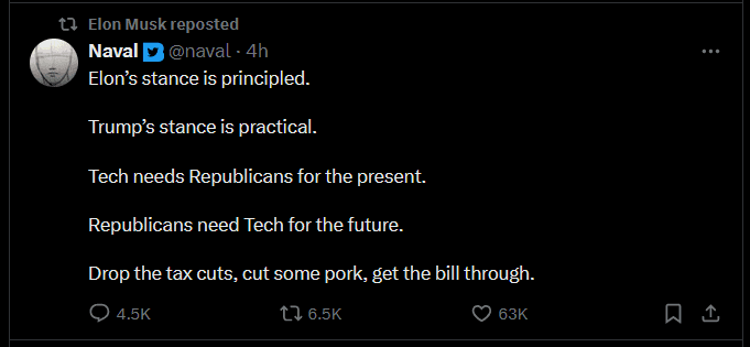 In short, Trump and Republicans need to "Drop the tax cuts, cut some pork, and get the bill through" so it aligns with MAGA and DOGE priorities (what you were elected to do), kith and make up, and make sure JD doesn't have to spend Christmas at two houses this year.
