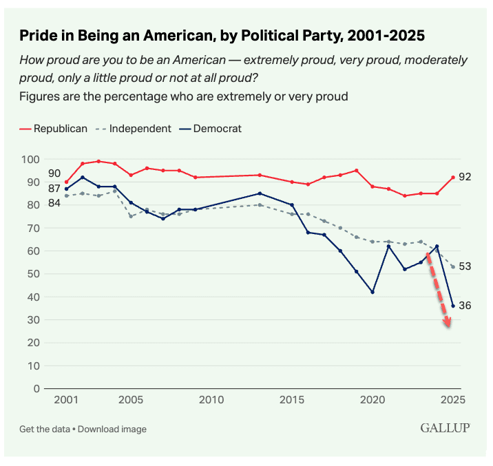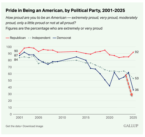 But HuffPost's anti-American article shouldn't come as a surprise because its readership target is deranged Democrats who increasingly hate America more and more. That data was visible in a recent 2025 Gallup poll...