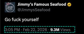 — Jimmy’s Famous Seafood (@JimmysSeafood) February 23, 2026