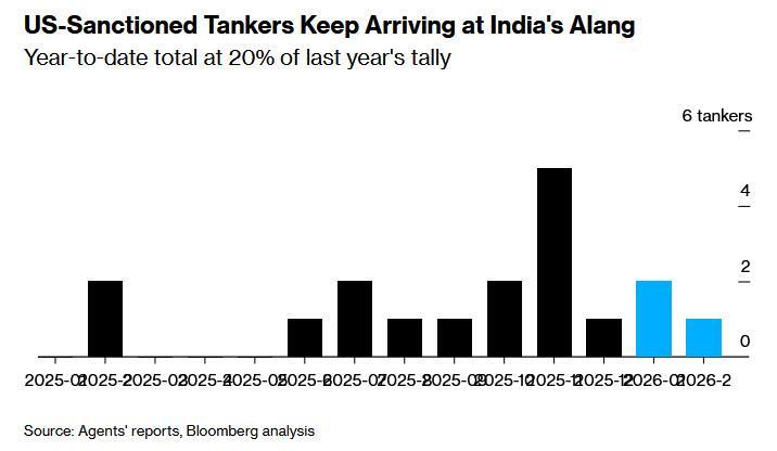 The total number of the U.S.-sanctioned tankers that have arrived at India’s Alang so far this year already accounts for 20% of the 15 vessels of the dark fleet welcomed in 2025, according to Bloomberg’s analysis.