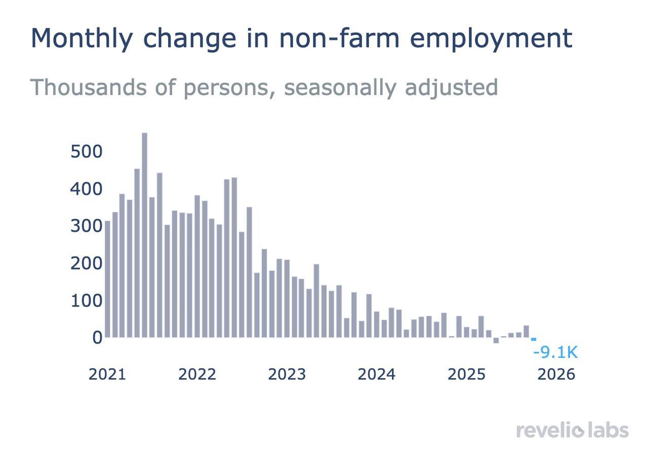 Another “real-time” source of jobs data is from Revelio Labs, which monitors job trends through company records and employee profiles. The most recent report from Revelio estimates a net decline of more than 9,000 jobs.