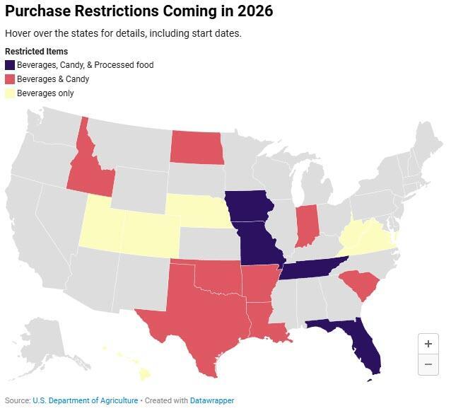 Indiana, Iowa, Nebraska, Utah, and West Virginia will implement purchase restrictions on Jan. 1, 2026. Idaho, Oklahoma, Louisiana, Colorado, Texas, Virginia, and Florida have starting dates from February to April. Arkansas, Tennessee, Hawaii, South Carolina, North Dakota, and Missouri will begin their bans between July and October.