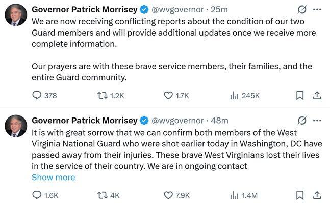 Earlier, D.C. Mayor Muriel Bowser described the attack on the two National Guard members as "targeted." West Virginia's governor initially stated that both Guardsmen had died, but later clarified that there is conflicting information about their conditions.