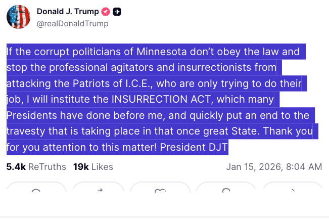 "If the corrupt politicians of Minnesota don't obey the law and stop the professional agitators and insurrectionists from attacking the Patriots of I.C.E., who are only trying to do their job, I will institute the INSURRECTION ACT, which many Presidents have done before me, and quickly put an end to the travesty that is taking place in that once great State," Trump warned.