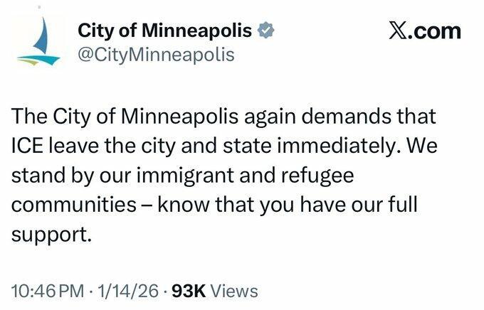 Instead of demanding that criminal illegal aliens leave, Democrats who run the metro area have posted on the city's official X account, demanding that ICE agents leave the town.