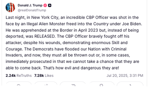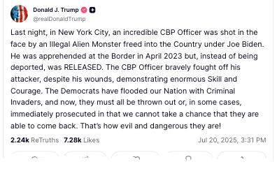 On Truth Social, President Trump chimed in, "Last night, in New York City, an incredible CBP Officer was shot in the face by an Illegal Alien Monster freed into the Country under Joe Biden."