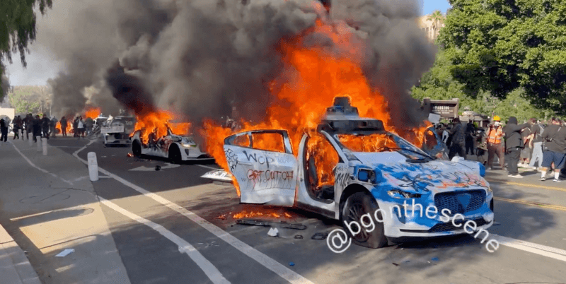 It appears that agitators called several Waymo self-driving autonomous cars to the site of one of the demonstration in Los Angeles, before vandalizing and burning them for absolutely no reason. pic.twitter.com/fnTG9kkuyz