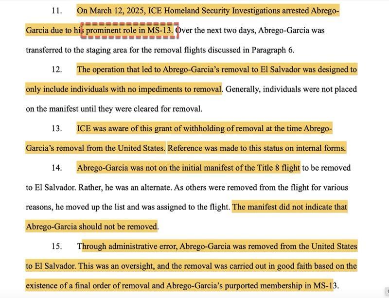 MSM and Dems only fixated on this from the filing: "On March 15, although ICE was aware of his protection from removal to El Salvador, Abrego Garcia was removed to El Salvador because of an administrative error." However, even as the filing admits the error, it continued: "final order of removal and Abrego-Garcia's purported membership in MS-13."