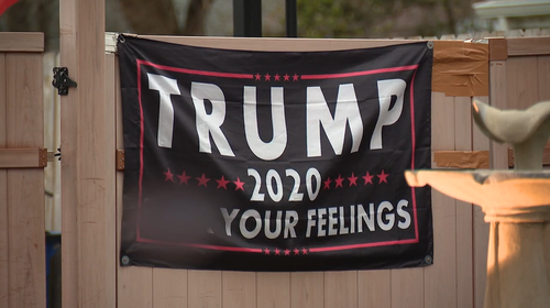 Local media coverage shows the resident has a large Trump 2020 "F*ck Your Feelings" banner attached to a front fence.