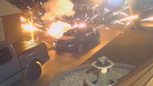 The second device was placed in an apparent attempt to blow up a car parked in the driveway, based on surveillance footage: