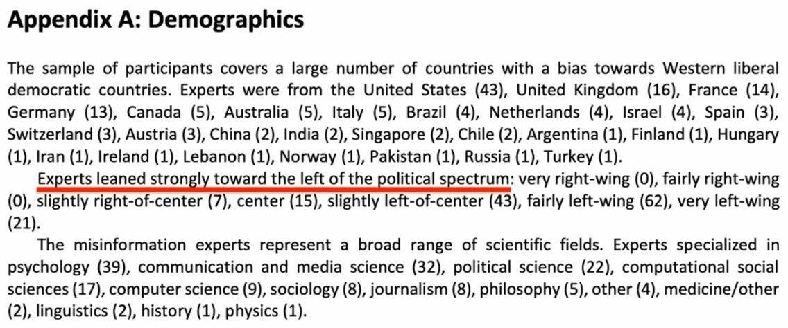 In appendix A we learn that “academic experts on misinformation” skew in one political direction. Guess which direction! Just take a gamble.