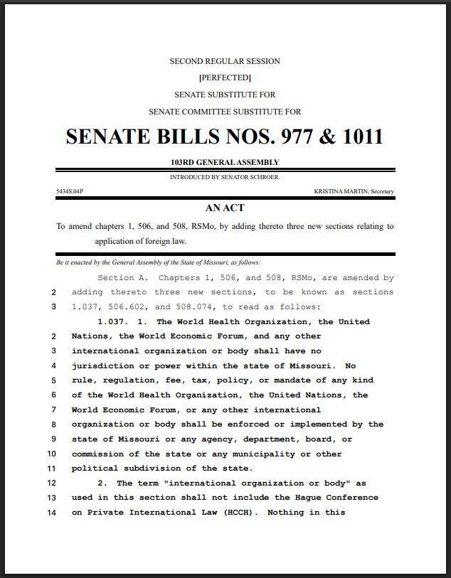 Blocks direct enforcement of WHO, UN, and WEF directives in Missouri