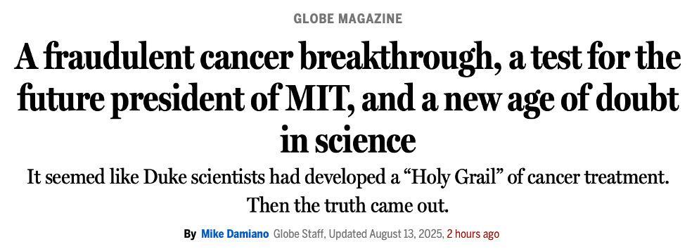 The Boston Globe published an incredible investigation highlighting yet another corruption scandal in academic research, this time involving two prominent research institutions—Duke University and MIT—tied together by Sally Kornbluth, the former head of research at Duke, who MIT picked as president in 2022. The Globe article adds to Kornbluth’s headaches as she has also been caught up in a dragnet of prestigious universities investigated by the Trump administration for alleged antisemitism and liberal political bias.