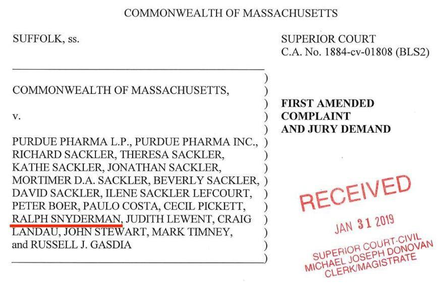 According to the complaint, Snyderman voted with the Sacklers to hire hundreds more sales reps to sell opioids; to implement incentive compensation policies that aggressively drove opioid sales; and, to pay out millions of dollars to already convicted criminals to help the Sacklers keep their loyalty.