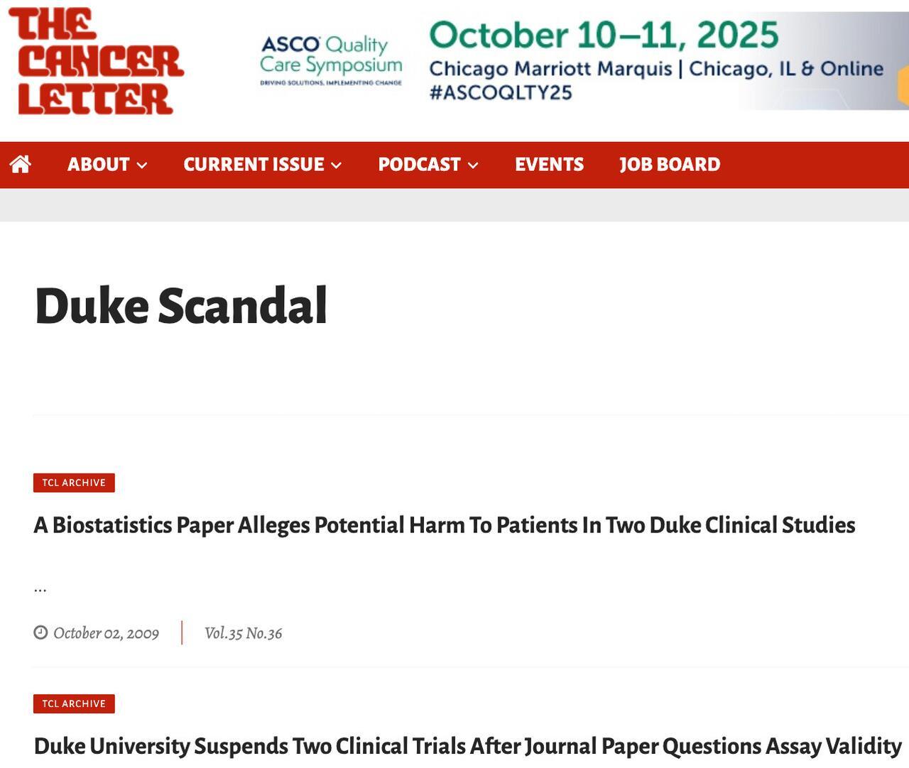 Much of the news about Duke’s cancer research corruption was broken by The Cancer Letter, such as a whistle-blower complaint by a medical student, who Kornbluth and other Duke administrators tried to shut down: “Duke Officials Silenced Med Student Who Reported Trouble in Anil Potti’s Lab.” The Cancer Letter has an entire series devoted to the Duke Scandal which you can find here.