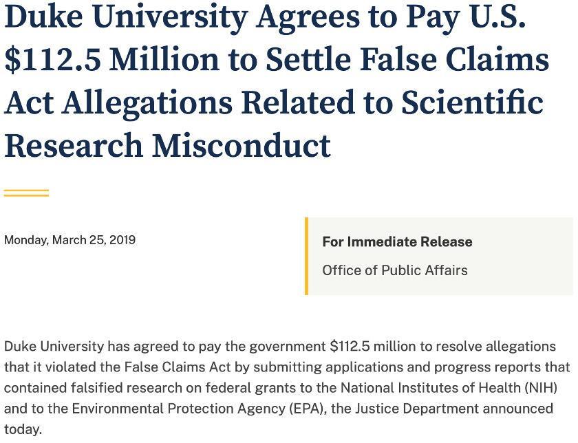 The Globe didn’t report this, but the Justice Department forced Duke to pay $112.5 million in 2019 because university officials submitted bogus data to win federal grants on a mouse study project.