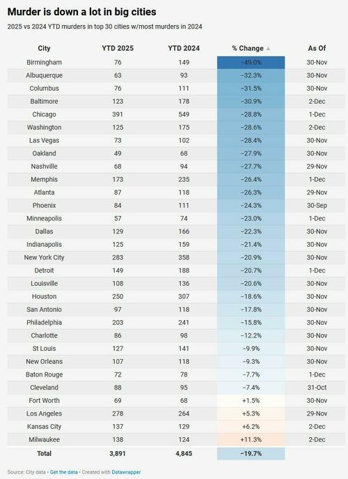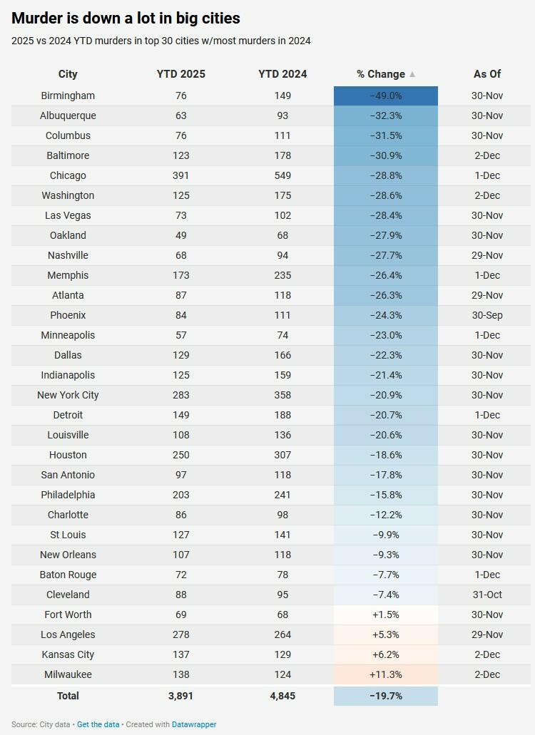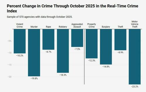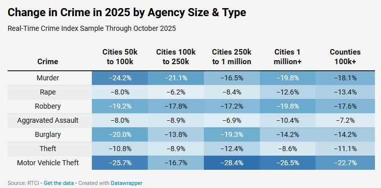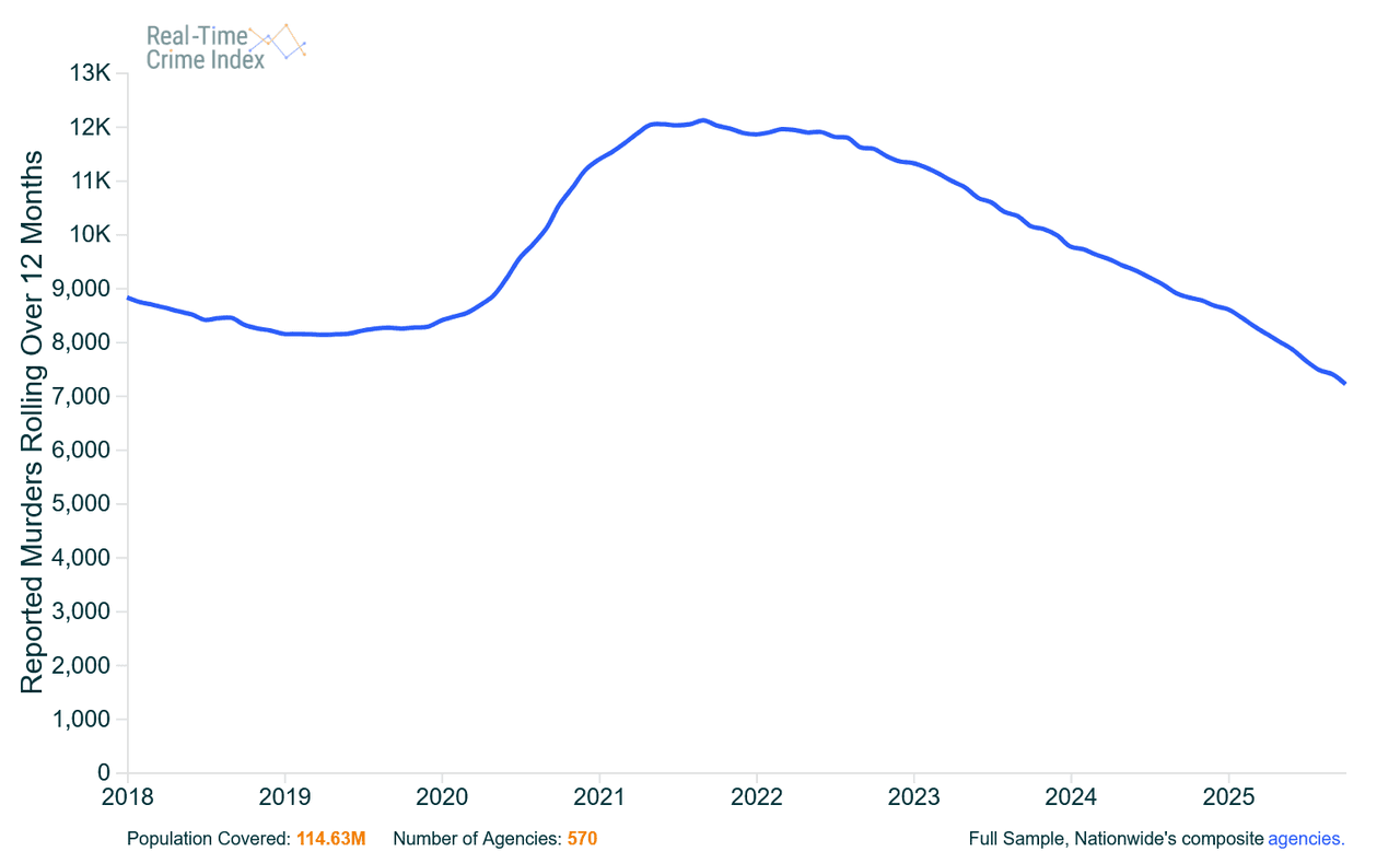 Using the Real-Time Crime Index that compares data from 570 law enforcement agencies, Asher reports a nearly 20% decline in murders in 2025 vs. the same period in 2024. The database excludes manslaughter, self-defense, negligence, or "accidental killings."