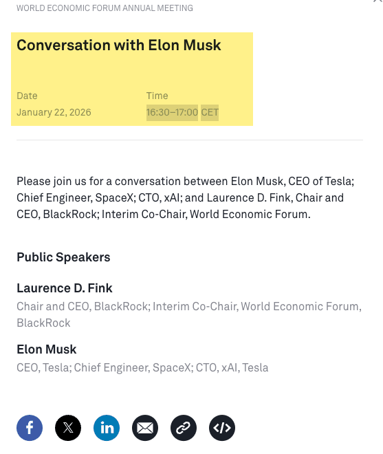 The WEF's website has confirmed that Musk will speak with BlackRock CEO Larry Fink from 1630 to 1700 CET (or 1030 to 1100 EST). Bloomberg notes that Musk was a "last-minute addition" for the Thursday afternoon conference. Also, this will be Musk's first WEF appearance.
