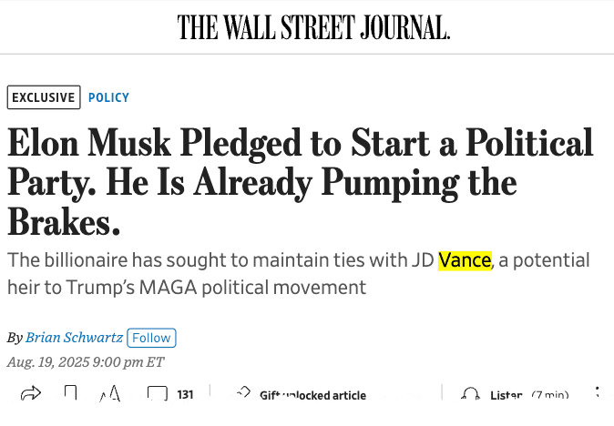 Focus on Tesla/SpaceX & GOP Ties: Musk is prioritizing his companies and preserving his relationship with Vice President JD Vance, seen as Trump's political successor. He has privately admitted forming a party could strain that alliance.