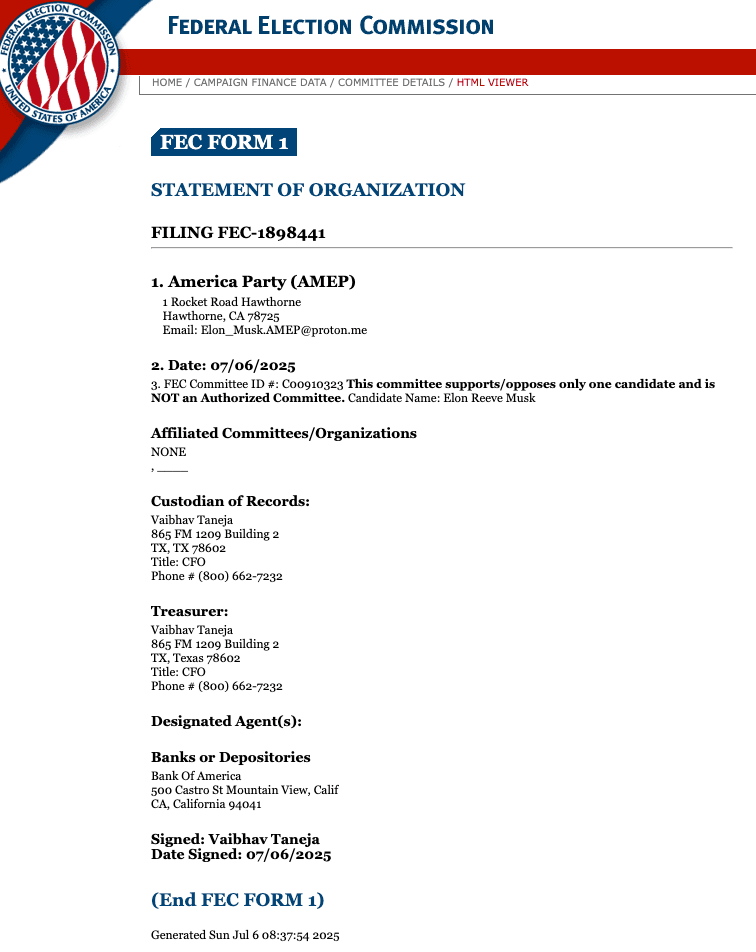 A new filing with the Federal Election Commission (FEC) confirms that Elon Musk's America Party (AMEP) is now official, as the billionaire sets out to challenge the entrenched "uniparty" duopoly in Washington.