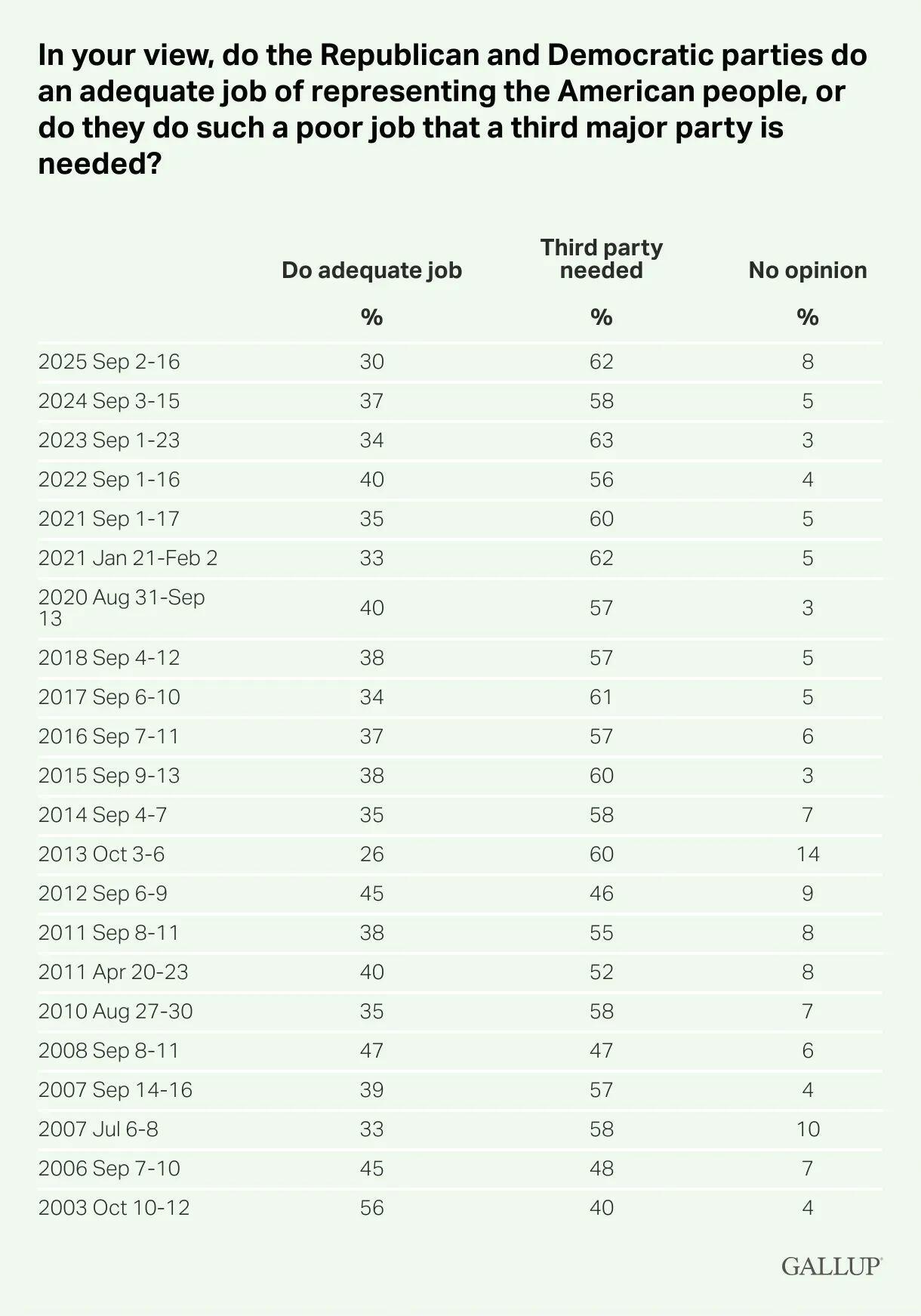 As political independence increases steadily, the desire for a major third party has also climbed. Sixty-two percent of American adults in 2025 said that a new party is needed compared to only three in ten adults who feel that the “Republican and Democratic parties do an adequate job of representing the American people.” In contrast, 56 percent of U.S. adults felt the two parties adequately represented Americans in 2003.