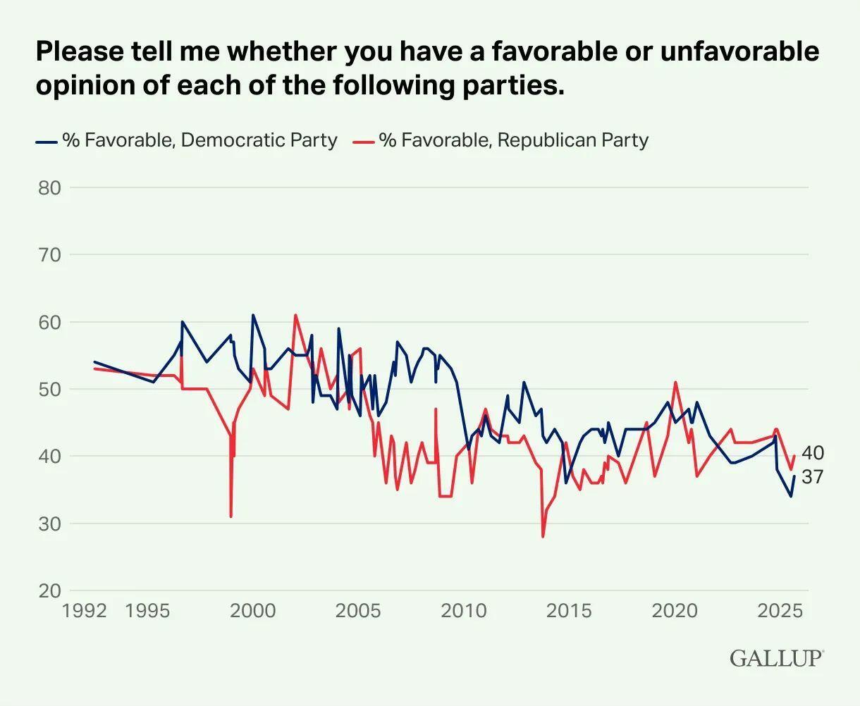 The desire for a third party makes sense when you examine the sharp declines in public favorability towards both Republicans and Democrats. In the early 2000s, more than six in ten Americans held a favorable opinion of both parties at some point. By the end of 2025, only four in ten felt favorably about Republicans, and only 37 percent felt that way about Democrats.