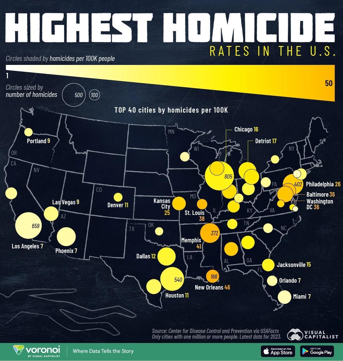 This map, via Visual Capitalist's Niccolo Conte, shows the top 40 U.S. cities by their homicide rate per 100,000 residents and the total number of homicides, based on the latest reported data from the Centers for Disease Control and Prevention.