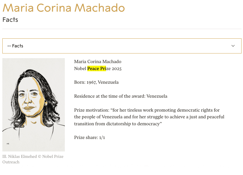 Early Friday, the Norwegian Nobel Committee awarded the prize to Venezuelan opposition leader María Corina Machado "for her tireless work promoting democratic rights for the people of Venezuela and for her struggle to achieve a just and peaceful transition from dictatorship to democracy."