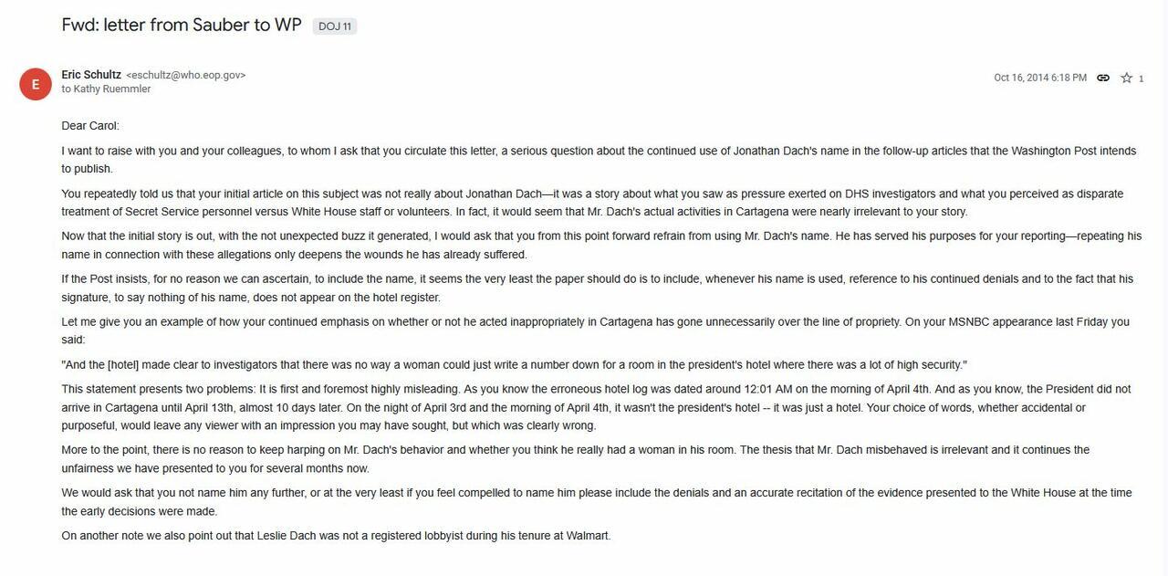 Finally, here is the letter that then-Obama White House Deputy Press Secretary Eric Schultz sent in coordination with Ruemmler, to Carol Leonnig who wrote the WaPo article exposing Jonathan Dach's prostitution scandal, where they beg her to "from this point forward refrain from using Mr. Dach’s name," as "He has served his purposes for your reporting—repeating his name in connection with these allegations only deepens the wounds he has already suffered."