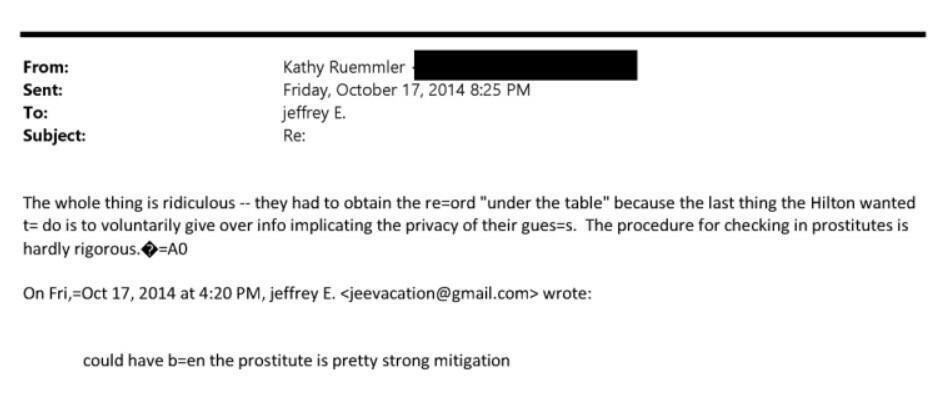 On October 17, 2014, Ruemmler forwarded Epstein a draft of her response to the Post reporter and asked for his input. In the draft she downplayed the allegations, writing: