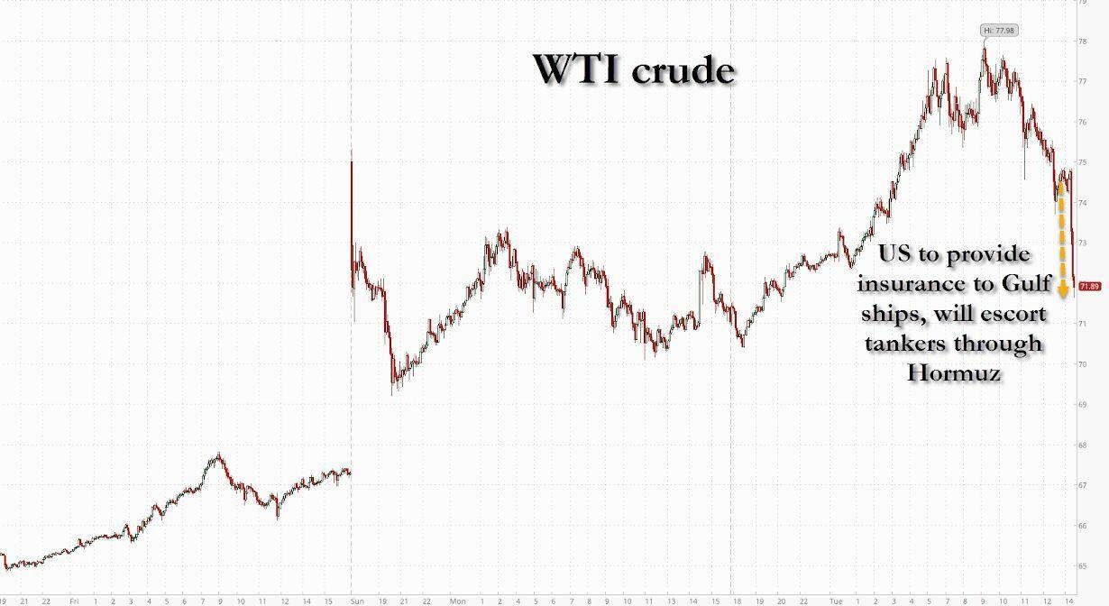 The price of crude instantly tumbled on Tuesday after the Trump administration is reportedly considering providing, or assisting in obtaining insurance for oil tankers crossing through the strait of Hormuz.