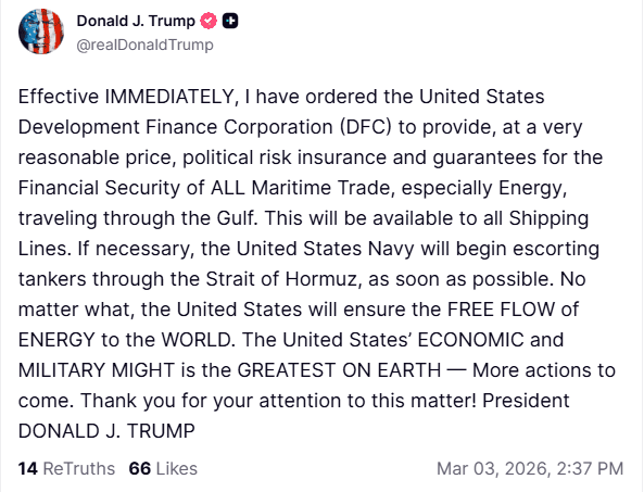 Effective IMMEDIATELY, I have ordered the United States Development Finance Corporation (DFC) to provide, at a very reasonable price, political risk insurance and guarantees for the Financial Security of ALL Maritime Trade, especially Energy, traveling through the Gulf. This will be available to all Shipping Lines. If necessary, the United States Navy will begin escorting tankers through the Strait of Hormuz, as soon as possible.