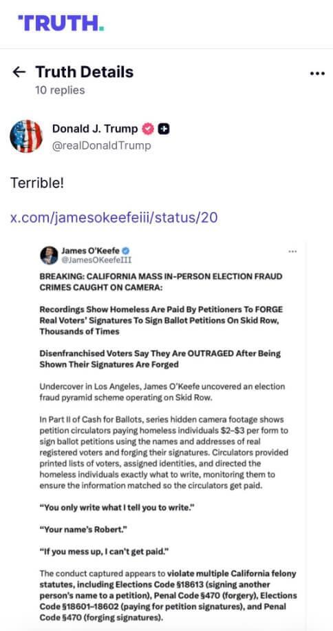 Multiple California felony statutes appear to have been violated, “including Elections Code §18613 (signing another person’s name to a petition), Penal Code §470 (forgery), and Elections Code §18601–18602 (paying for petition signatures),” OMG pointed out.