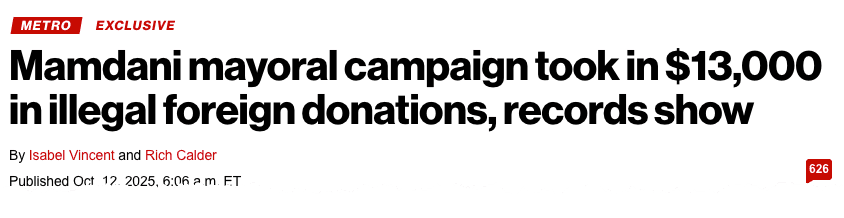 By Sunday, The New York Post broke a story about how "Mamdani's campaign quietly took in nearly $13,000 in potentially illegal foreign donations — including one from his mother-in-law in Dubai."