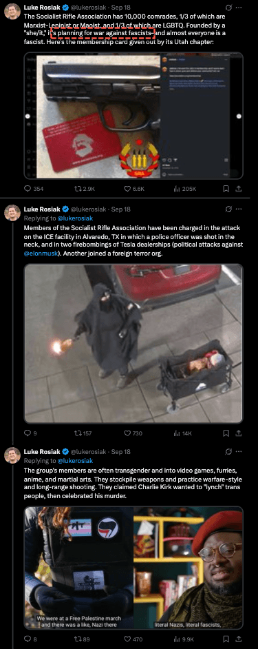 The radical organization has, however, spread disinformation to label Kirk a threat. On SRA’s Reddit forum, a thread falsely claimed years ago that “Charlie Kirk, CEO of Turning Point USA, is openly calling for the lynching of transgender individuals.” After Kirk was assassinated, SRA members mocked him, expressed enthusiasm, and wished that the man who shot President Donald Trump had similar marksmanship.