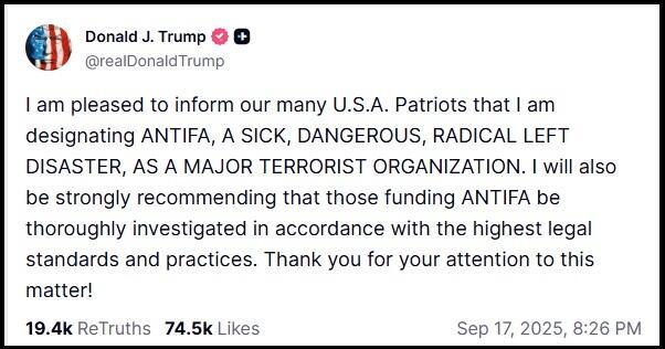 “I am pleased to inform our many U.S.A. Patriots that I am designating ANTIFA, A SICK, DANGEROUS, RADICAL LEFT DISASTER, AS A MAJOR TERRORIST ORGANIZATION,” Trump posted on Truth Social.
