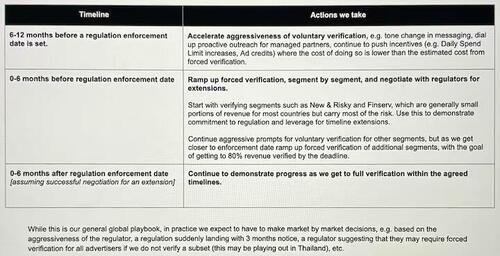 This was all part of a broader strategy for delaying or weakening regulatory action, according to the report - with the playbook guiding Meta officials to offer voluntary measures, requesting time to assess their impact, and resisting universal advertiser verification unless laws leave no alternative.
