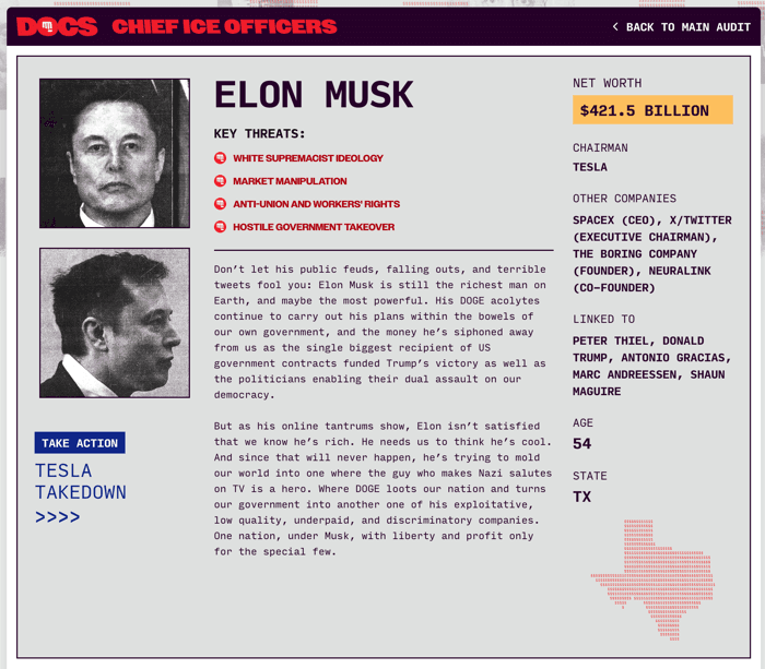 The group recently published its first five audits, each featuring a high-profile billionaire with direct or indirect links to the Trump agenda. The names include some of the wealthiest and most influential figures in American business: Elon Musk, Palantir CEO Alex Karp, former Department of Government Efficiency (DOGE) official Antonio Gracias, Silicon Valley "supervillain" Peter Thiel, and Amazon's Jeff Bezos.