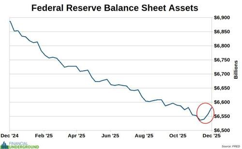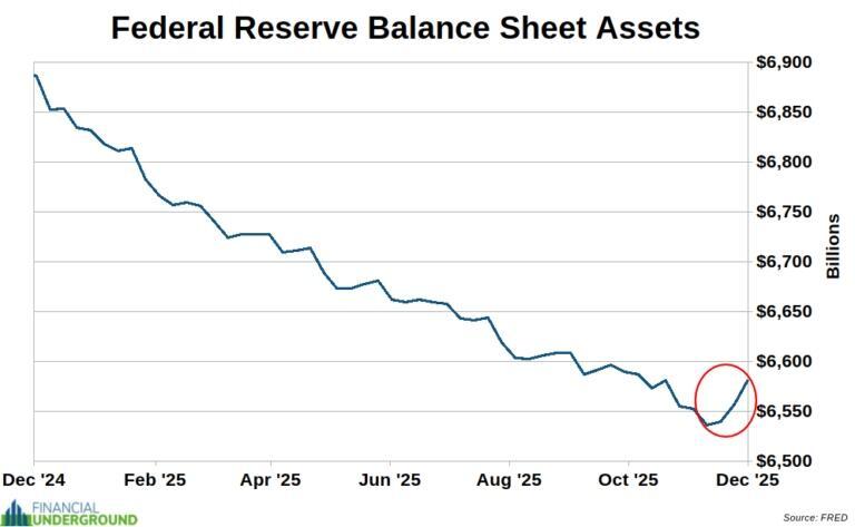 The Fed insists this isn’t quantitative easing, calling it “reserve management” and pointing out that it isn’t explicitly targeting long-term Treasuries. That’s just wordplay. Buying Treasuries with newly created money is money printing, regardless of what label they attach to it. The Fed’s balance sheet is expanding again. A new printing cycle has begun.
