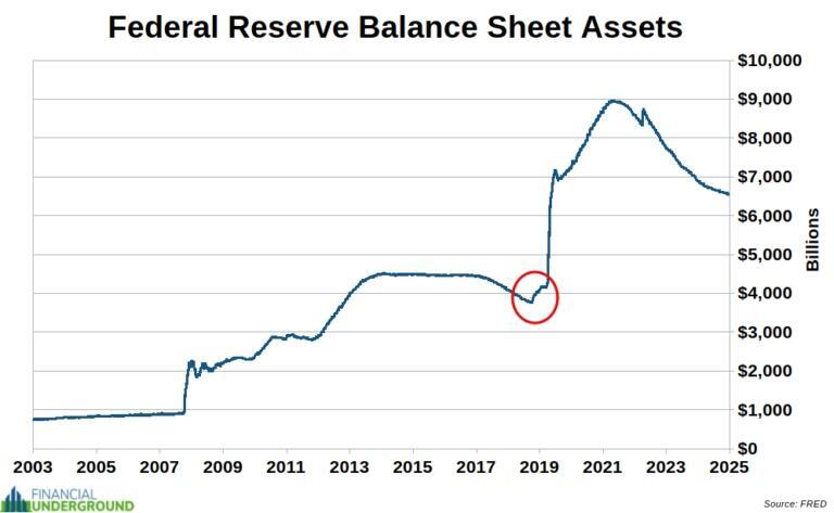 What makes the current situation especially telling is that the Fed is entering another balance-sheet expansion phase even though the balance sheet is still more than 50% larger than it was before the Covid mass psychosis. Before 2020, the Fed’s balance sheet was roughly $4 trillion. It exploded to nearly $9 trillion during the Covid response. Even after so-called “quantitative tightening,” it remains around $6.5 trillion — nowhere near its pre-Covid level.