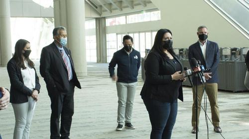 (L-R) San Diego congressmen Scott Peters, Juan Vargas, San Diego Mayor Todd Gloria, Vice Chairman of the San Diego County Board of Supervisors Nora Vargas, and Congresswoman Sara Jacobs at the San Diego Convention Center on March 27, 2021. (Jane Yang/Epoch Times)