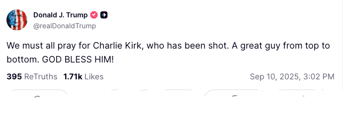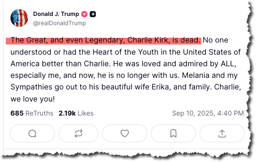 Trump states on Truth Social that Charlie Kirk has died.