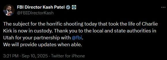 — FBI Director Kash Patel (@FBIDirectorKash) September 10, 2025