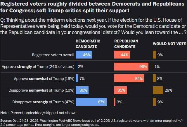Meanwhile President Donald Trump’s approval rating continues to weigh heavily on Republicans. A Washington Post–ABC News–Ipsos poll found that 41% of Americans approve of his handling of the presidency, compared with 59% who disapprove. Among independents, only 30% approve, while 69% disapprove. On the economy - long seen as Trump’s strongest issue - he fares worse, with 37% approving and 62% disapproving. “These Trump economic numbers are in line with other recent polls,” one report noted. “This is a serious problem for Republicans.”
