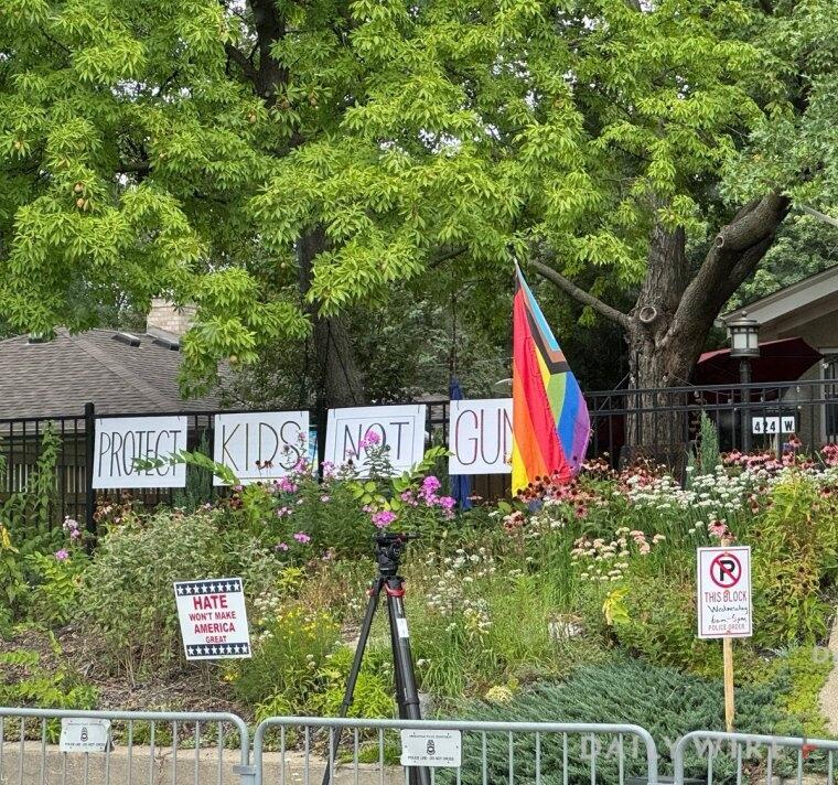 Someone has also placed a Pride/transgender flag next to signs reading “PROTECT KIDS NOT GUNS.”