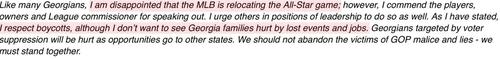 So which is it? Not wanting to see families hurt, or being all-in for the boycott of Atlanta, which certainly should affect the city tax base? She wants to have it both ways, boycott but nobody hurt. That's because unlike MLB, she wants to win public office, and knows that screwing over black businesses, which will get it in the teeth with this MLB maneuver, is going to make her unpopular.