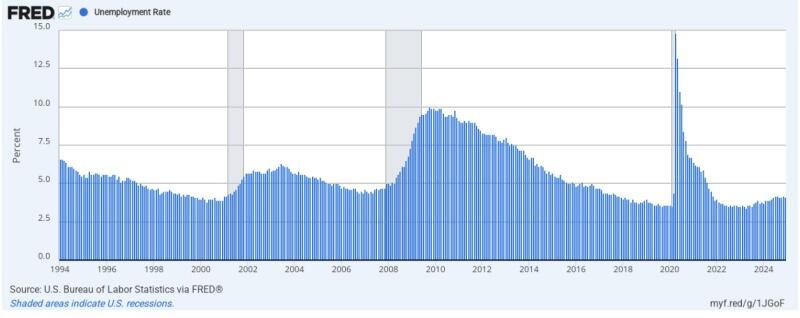 Of course, during the last 30 years there have been three recessions (shaded area) and no such full-employment perfection was even remotely achieved. The short spells of 4% unemployment or under, in fact, were few and far between—in stark contrast to the CBO baseline which presumes 4% unemployment year after year until 2054.