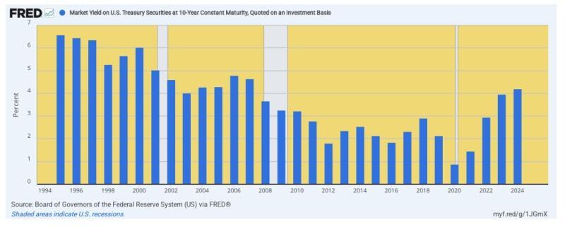Likewise, it assumes that the bond pits will have no problem funding more than $100 trillion of new Treasury debt at yields which average just 3.6% over the next 30 years. Of course, the actual weighted average yield in the Treasury market today stands at 4.2% and the fulcrum 10-year note has been cycling around 4.4%, albeit at this point the prospective debt inundation is just getting started.
